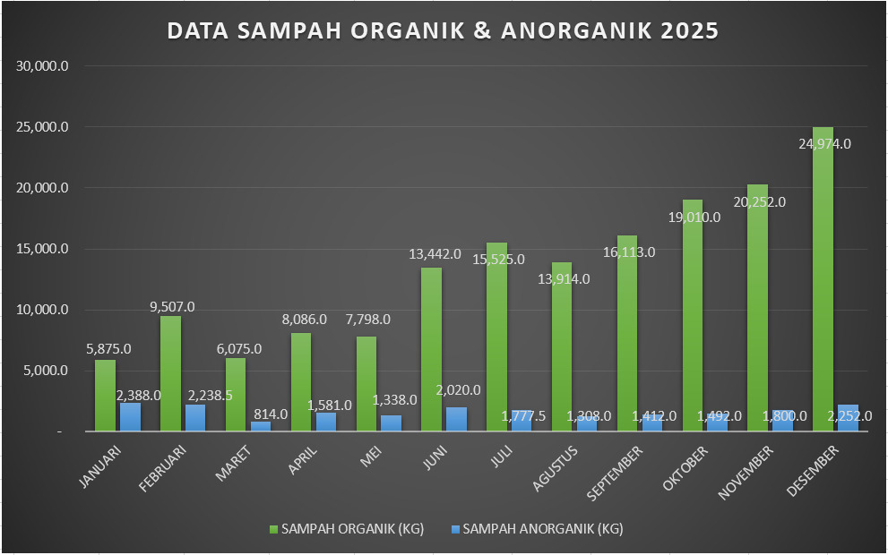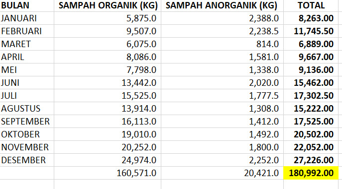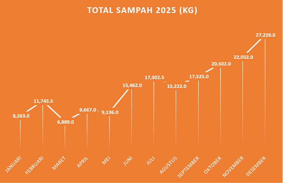 Data Pengelolaan Sampah Data Sampah 2025 Total sampah sampai dengan Bulan Desember 2025 adalah 180.992 kg, dengan rincian sebagai berikut Data Sampah 2024 Total sampah sampai dengan Bulan Desember 2024 adalah 50.050,8 kg, dengan rincian sebagai berikut Data Sampah 2023 Total sampah tahun 2023 adalah 69.157,1 kg, (sd Desember) dengan rincian sebagai berikut : Data Sampah 2022 Total sampah tahun 2022 adalah 43.471,50 kg, dengan rincian sebagai berikut :